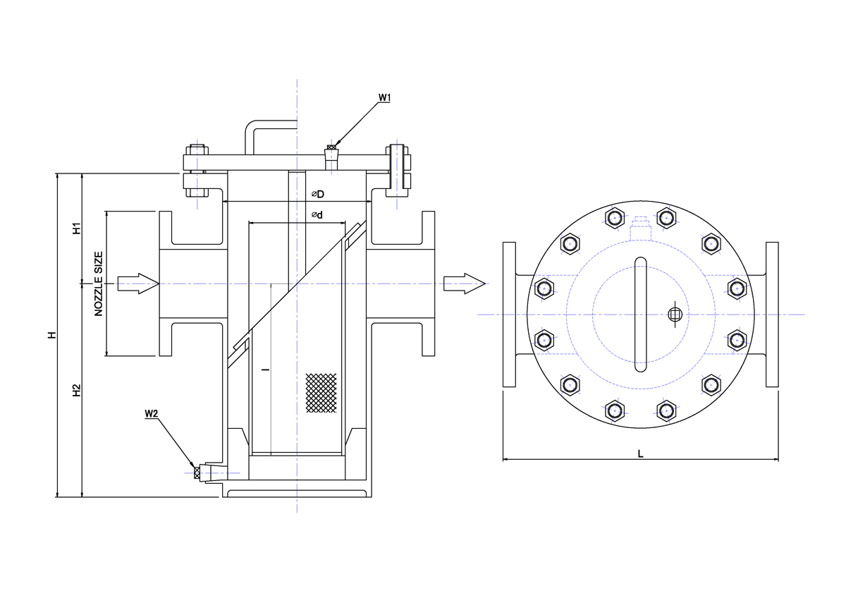 バケット型ストレーナーは主として水平な配管中に配置され、Y型ストレーナより濾過面積が大きいのが特徴です。篭型エレメントは上部カバーを開放し取りだしが出来るため捕捉されたスラッジ(夾雑物)の排出が容易です。入口と出口がオフセットされており出口側が入口より低い位置に取り付けられています。