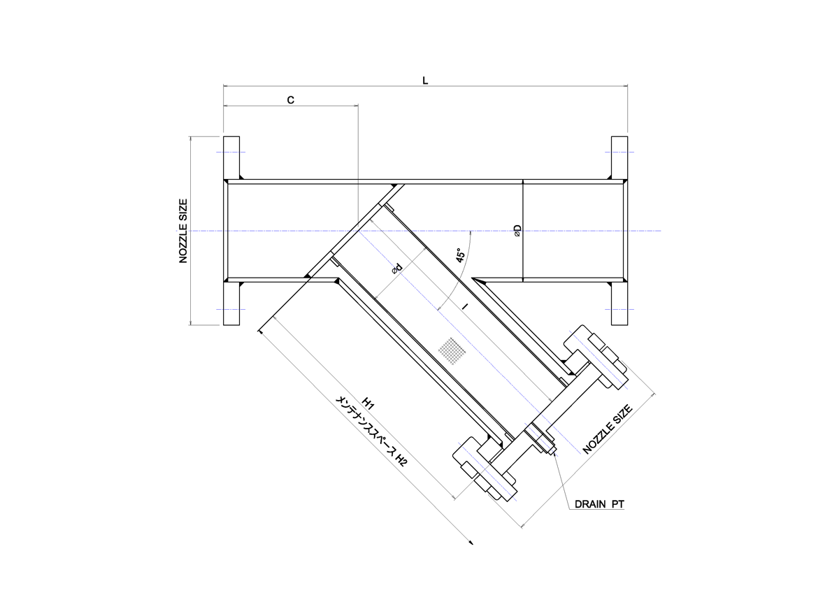 溶接式Y型ストレーナ。Y型はストレーナの中で最も多く使用されている汎用ストレーナです。 コンパクトな構造のため取付スペースを取りません。濾過面積が大きく高流量の処理が可能です。